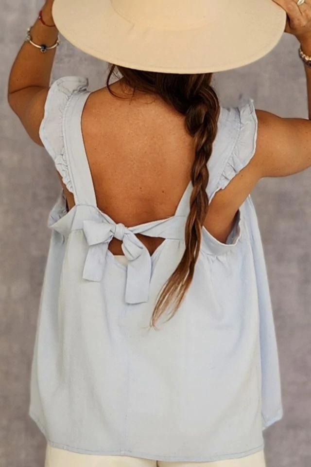 Blusa, bretel con volados, tiene lazos en la espalda que se anudan y el cuerpo con frunces y volado