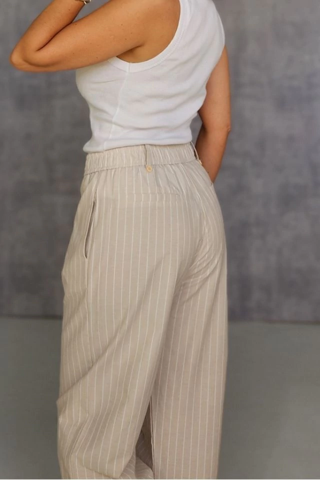 Pantalón amplio, tiene bolsillos laterales, elástico en la cintura y presillas con boton al tono.